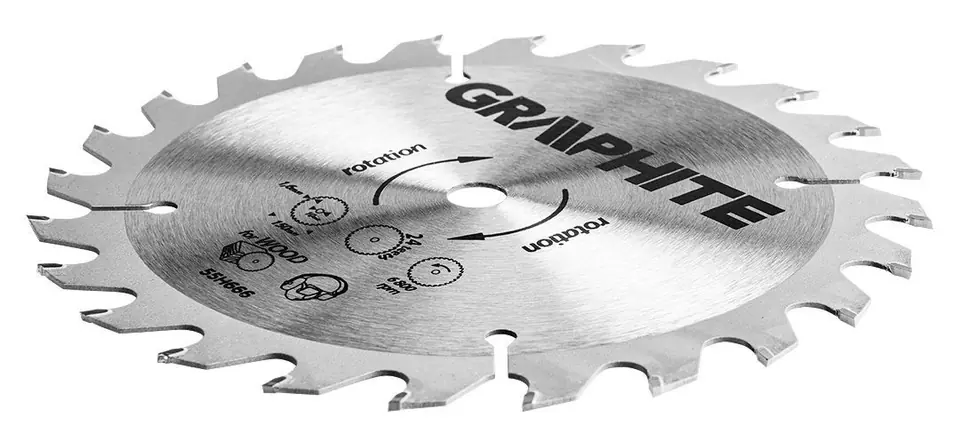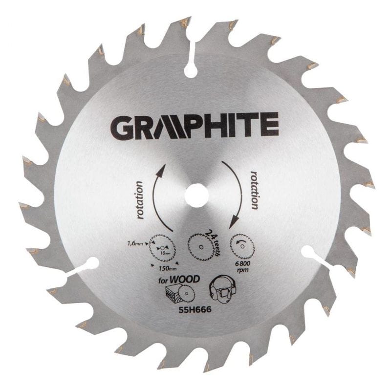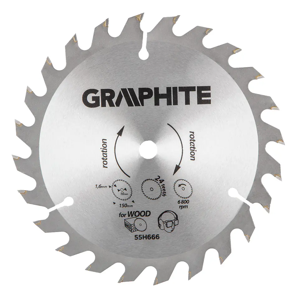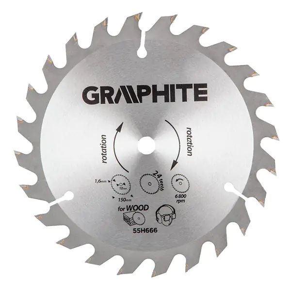 GraphITE forigan saw blade (ref. 55H666) with an external diameter of 150 mm, made of MN65 manganese steel alloy with high temperature resistance and deformation. Teeth with YG6A cemented carbide overlays allow rough cutting of wood and wood-based materials such as plywood, chipboard, MDF.