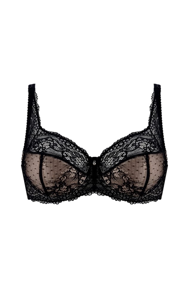 Zmysłowy i uwodzicielski biustonosz półusztywniany doskonale podkreślający i podtrzymujący biust. Wykonany w całości z czarnej wyrafinowanej koronki ozdobionej delikatnym kwiatowym motywem. Dolna część miseczek usztywniona od wewnątrz bawełnianą wyprofilowaną wkładką gorseciarską w cielistym kolorze. Połyskujące zdobienie, umieszczone między miseczkami dodaje biustonoszowi wyjątkowego uroku.