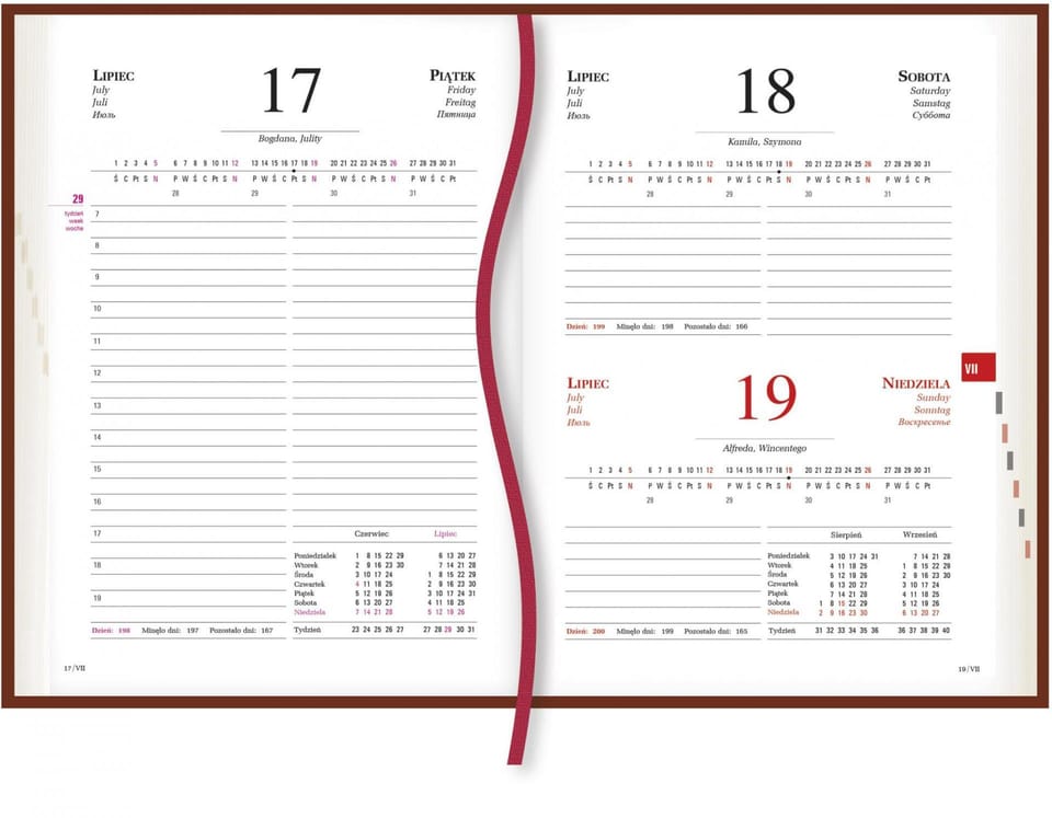 Endpaper - administrative Polish and political map of Europe, binding - leather-like Vivella, one ribbon, perforated corners.
