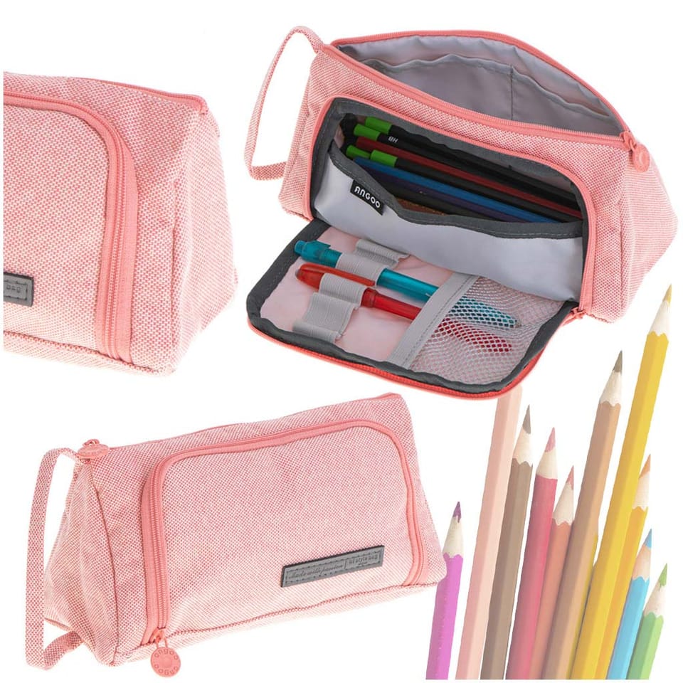 SCHOOL PENCIL CASE DOUBLE POUCH COSMETIC BAG PINK