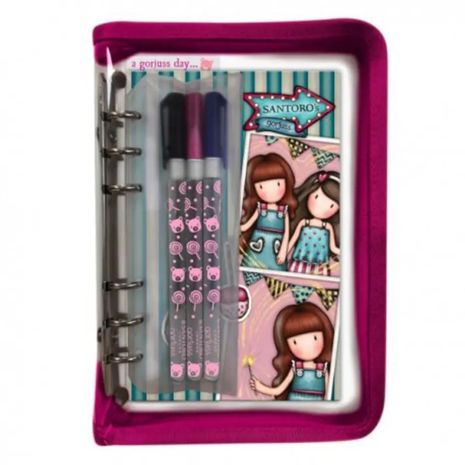 School Supplies Set, Organizer - Gorjuss - Fireworks The fantastic Fireworks series is decorated with Gorjuss girls with glowing fireworks, on a burgundy background, brightened with pastel green. On the back fireworks, colorful garlands, cotton candy - everything that we find in a cheerful amusement park. A set of school supplies packed in a transparent pencil case fastened with a special zipper. Inside there is a notebook with 80 pages decorated with a decorative print. On each page there is a place for the date, time and notes so it can act as an organizer or journal. Also: 3 pens - navy blue, pink and black, placed in a zippered pocket. In addition - a ruler that can act as a bookmark. Dimensions: 15 cm x 21.5 cm x 2.5 cm. A fun Fairground collection full of backpacks, accessories and stationery, which refers to the mysterious adventures experienced in the Amusement Park. There is no shortage of fireworks, carousels, barrels of laughter, swings and prizes won. Funny pompons, patterns full of delicacies or metal pendants will take us to the colorful world of Santoro. This is a collection that we will treasure for many years. Follow the girls, the heroines of series 4: Up & Away, Fireworks, Carusel and First Prize and discover an exciting collection full of wonderful treats! 1137GJ03