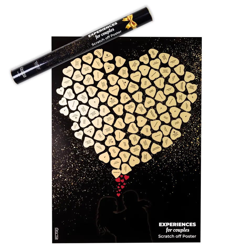For lovers who want moreThe experience for a couple is more than just an object – it's a scratching poster that contains over 100 suggestions for experiences that will make the moments together unforgettable, and there will be no place for boredom in the relationship. Just choose and then scratch the field to start your adventure together and turn up the atmosphere with a little uncertainty. How it worksTo make the moments together more exciting, you will find out about what awaits you only after scratching the selected field. By dividing them into categories, you can easily choose a proposal tailored to your current capabilities or desires: What you can do right away is hidden under the slogan Small pleasures; Joint activities are interesting ways to spend time together, most often away from home; A little bigger challenges require a bit of organization, and sometimes also getting out of your comfort zone; Adventures are events that you will remember years later; The icing on the cake is the Great Experiences - more spectacular, but they require planning and a little more financial resources than the experiences of the other categories. Not only for Valentine's Day and anniversariesZdrapka Experience for a couple is a dream gift for Valentine's Day or anniversary, because you will not get bored quickly. Thanks to her, the celebration of love will last all year round! The experiences on the scratch card have been constructed in such a way as to stimulate the imagination and create beautiful memories that you will be happy to recall years later. We also know that the appetite grows as you eat, so even if you scratch off all the golden fields, the poster will definitely awaken your creativity and even after years will be a great inspiration to plan your next exciting, joint experiences. An original gift for a weddingThe birthday in the form of a poster, packed in an aesthetic tube, is also a great idea for a wedding gift for the bride and groom, a gift for the anniversary and any other occasion when you give a gift for two. The Experience scratch card is something unobvious, memorable, completely different from glasses or a traditional bottle of wine. This is a good gift for a couple who already has everything and values well-spent moments more than material things. The experiences on the scratch card have been chosen so that when handing it, you do not have to be ashamed: the tasks are interesting, surprising, and many of them have the potential to become memories for life.