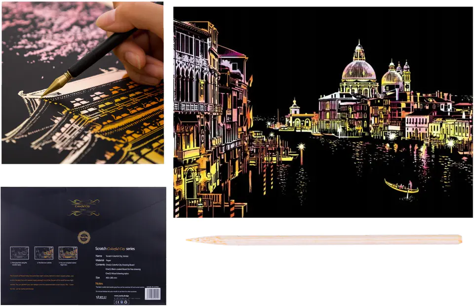 Introducing an amazing MAGIC SCRATCH CARD. Behind its black surface, the scratch card hides the best night scenery in the world. Just scratch the gray lines with a wooden stylus, and each line will become a colorful part of the amazing night scenery.