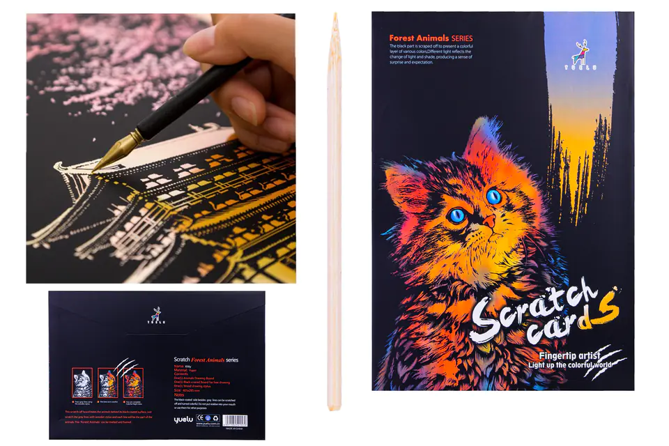 Introducing an amazing MAGIC SCRATCH CARD. Behind its black surface, the scratch card hides the best night scenery in the world. Just scratch the gray lines with a wooden stylus, and each line will become a colorful part of the amazing night scenery.