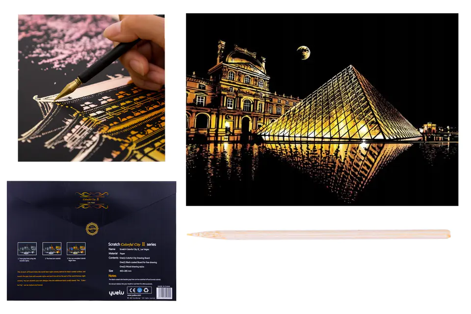 Introducing an amazing MAGIC SCRATCH CARD. Behind its black surface, the scratch card hides the best night scenery in the world. Just scratch the gray lines with a wooden stylus, and each line will become a colorful part of the amazing night scenery.