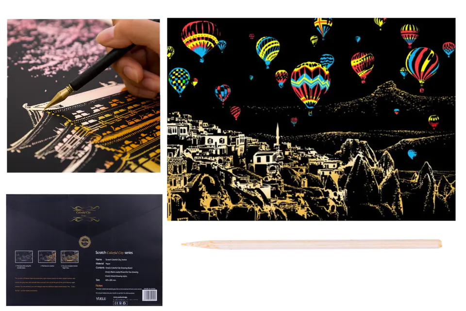 Introducing an amazing MAGIC SCRATCH CARD. Behind its black surface, the scratch card hides the best night scenery in the world. Just scratch the gray lines with a wooden stylus, and each line will become a colorful part of the amazing night scenery.