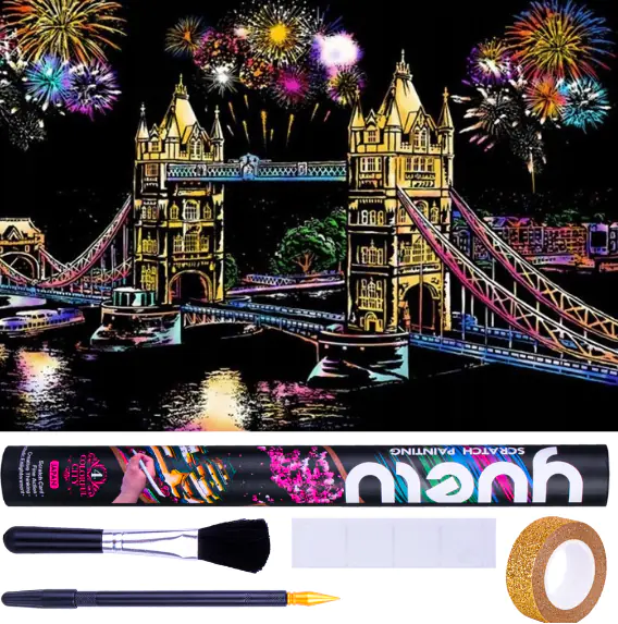 Introducing an amazing big MAGIC SCRATCH CARD. Behind its black surface, the scratch card hides the best night scenery in the world. Just scratch the gray lines with a wooden stylus, and each line will become a colorful part of the amazing night scenery.