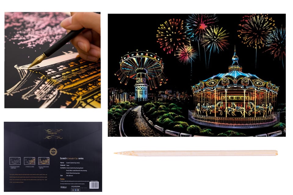Introducing an amazing MAGIC SCRATCH CARD. Behind its black surface, the scratch card hides the best night scenery in the world. Just scratch the gray lines with a wooden stylus, and each line will become a colorful part of the amazing night scenery.