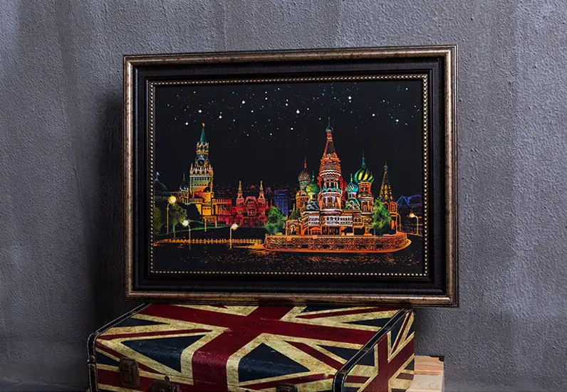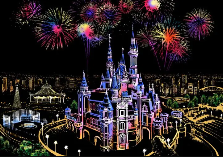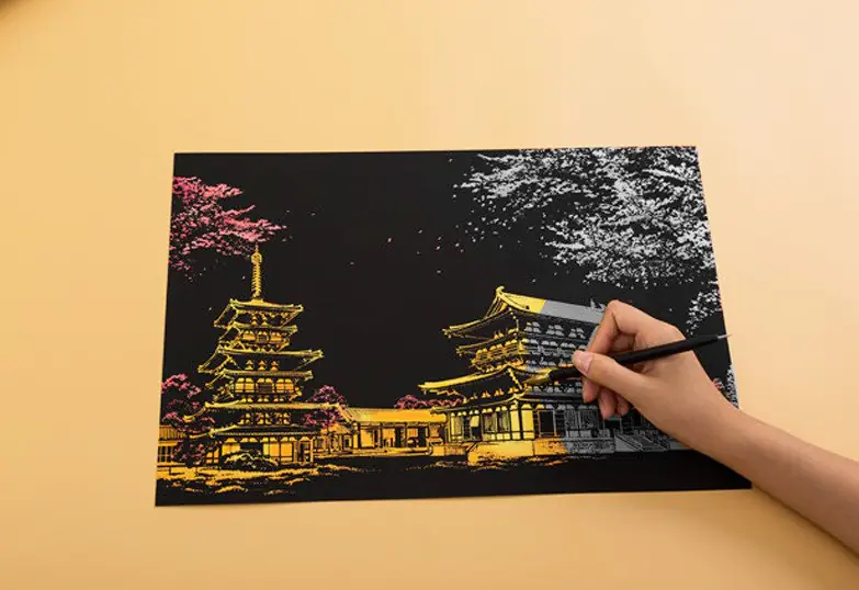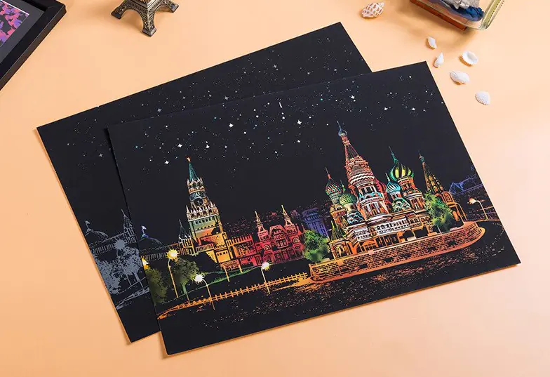 Introducing an amazing big MAGIC SCRATCH CARD. Behind its black surface, the scratch card hides the best night scenery in the world. Just scratch the gray lines with a wooden stylus, and each line will become a colorful part of the amazing night scenery.