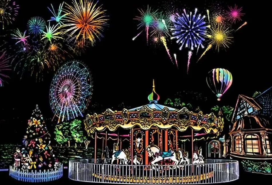 Introducing an amazing big MAGIC SCRATCH CARD. Behind its black surface, the scratch card hides the best night scenery in the world. Just scratch the gray lines with a wooden stylus, and each line will become a colorful part of the amazing night scenery.