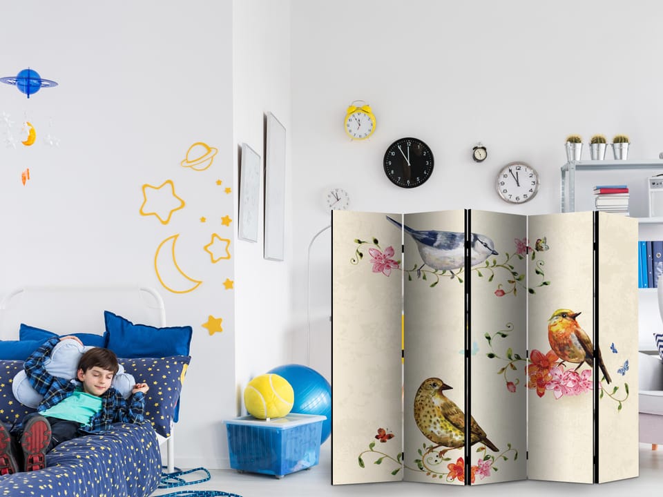 Decorative screen "5-piece screen - Bird singing II [Room Dividers]" is a unique decoration for modern interiors. A 5-piece, made of wood and double-sided printed screen will not only discreetly divide the space but also create an amazing arrangement in the interior. Perfect workmanship and an original motif in Full HD print quality will make room screens give any interior a unique charm.