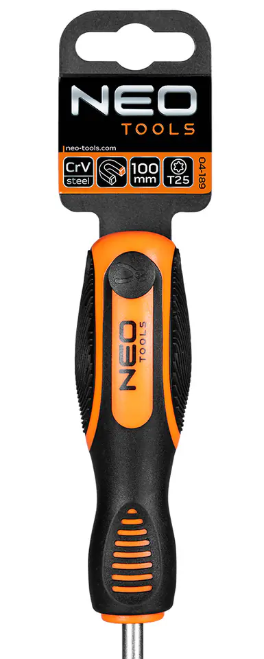 Torx NEO screwdriver (ref. no. 04-189) suitable for mechanical work and DIY. 100 mm long tip made of durable chrome-vanadium steel, ensuring a long tool life. The T25 magnetic tip made of hardened steel makes it easy to work with the tool. Ergonomic plastic handle covered with non-slip material ensures safety and comfort during operation. The NEO brand meets the expectations of professionals.