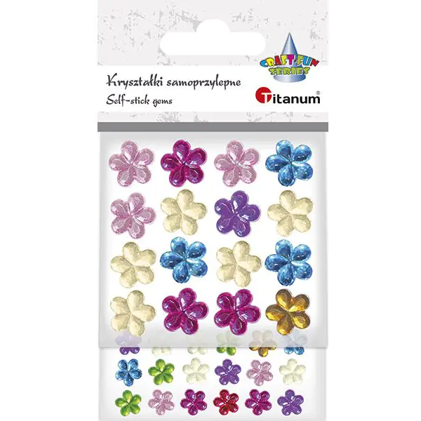 Self-adhesive crystals, shape: flowers, colour: pink, violet, blue, green, gold, diameter: mix. Blister 52 pcs.