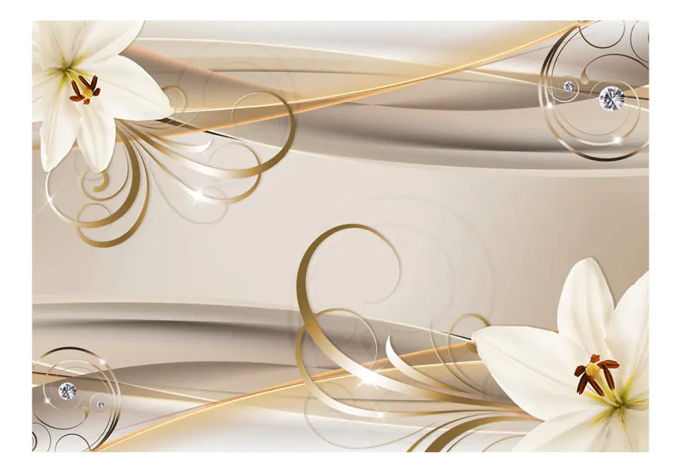 Self-adhesive wall mural "Self-adhesive mural - Lilies and spirals of gold" is printed in HD technology at a resolution of up to 600 dpi, thanks to which colors are vivid and details are perfectly reproduced, regardless of the format of the wallpaper. The print is applied to a self-adhesive film with a matte finish with a weight of 50 g/m². Both the material itself and the print used are waterproof and resistant to UV radiation, so that the colors do not fade, even with prolonged exposure to sunlight.