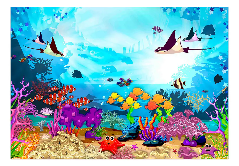 Self-adhesive wall mural "Self-adhesive mural - Underwater fun" is printed in HD technology at a resolution of up to 600 dpi, thanks to which the colors are vivid and the details are perfectly reproduced, regardless of the format of the wallpaper. The print is applied to a self-adhesive film with a matte finish with a weight of 50 g/m². Both the material itself and the print used are waterproof and resistant to UV radiation, so that the colors do not fade, even with prolonged exposure to sunlight.