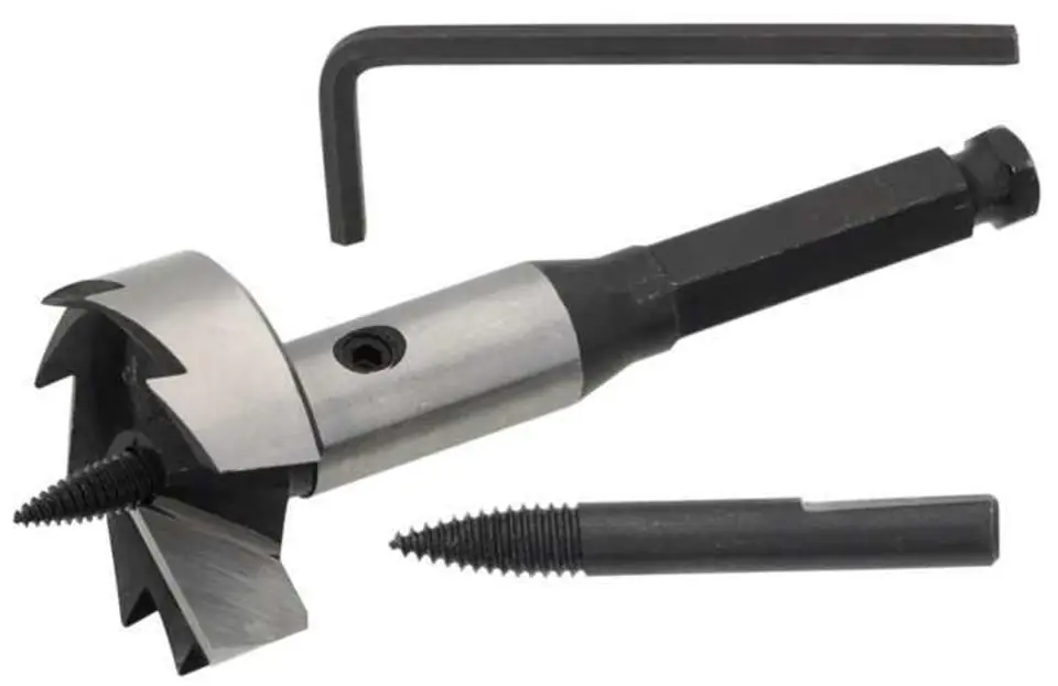 "Self-feed Bits". Self-feeding drill bit, i.e. with replaceable pull screw. The drill feed is fast and cutting the hole does not require axial pressure. Each drill bit is supplied with a spare retracting screw and an Allen key. The drill has a 11 mm hexagonal chuck, matching extension 20116-0504.