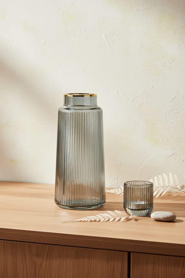 gray with a golden edge and embossing in vertical stripes. Nowadays, a vase is not only a vessel for flowers, but also a unique decoration of the interior. Fresh cut flowers, as well as artificial ones make the interior more pleasant and in some