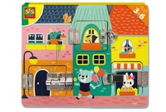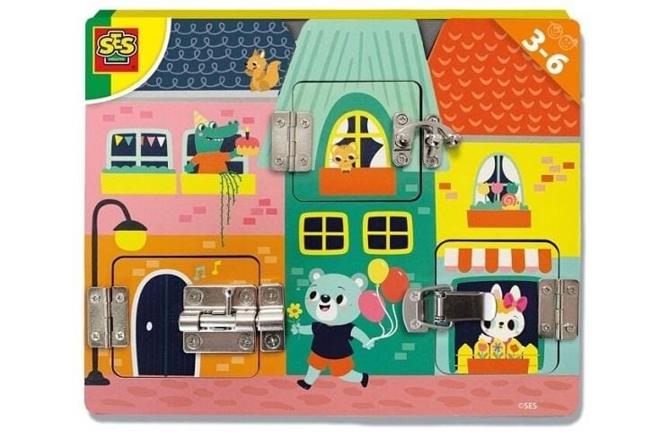 SES Creative I learn - Latches board - Sustainable wooden latches board, Happy illustrations, Age 3+