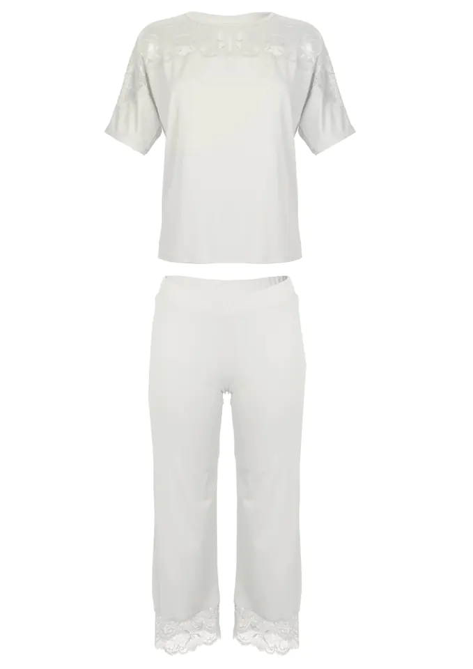 WYKONANY Z MIĘKKIEJ DLA CIAŁA WISKOZOWEJ TKANINY IDEALNY DLA KAŻDEJ KOBIETY. LUŹNIEJSZA KOSZULKA DZIĘKI KTÓREJ MOŻNA ZATUSZOWAĆ SWOJE NIEDOSKONAŁOŚCI. CAŁOŚĆ KOMPLETU Z DŁUŻSZYMI SPODENKAMI IDEALNIE NADAJĘ SIĘ NA CHŁODNIEJSZE WIECZORY. CAŁOŚĆ KOMPLETU ZDOBI DELIKATNA KORONKA.