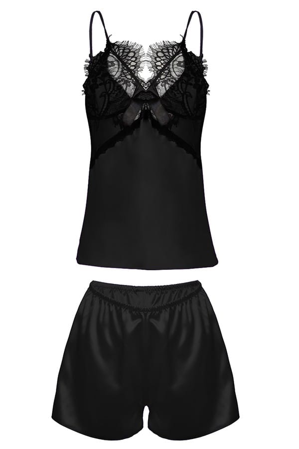 Zjawiskowy komplet wykonany z czarnej satyny. Bluzeczka na cienkich ramiączkach o regulowanej długości, z profilowanymi miseczkami, w konstrukcji soft (bez fiszbin), które dodatkowo w środkowej części podszyto czarną tkaniną. Efekt? Linia dekoltu, która pięknie i zmysłowo zdobi ciało, ale jednocześnie nie odsłania piersi. Do tego idealnie pasujące szorty, na gumce w pasie. Świetny zestaw z nowej kolekcji marki DKaren. Skład: 100% poliester.