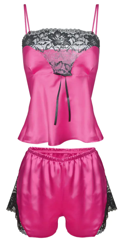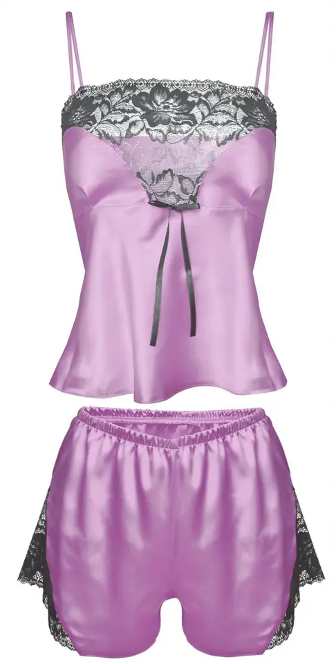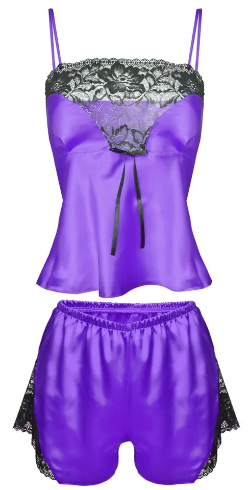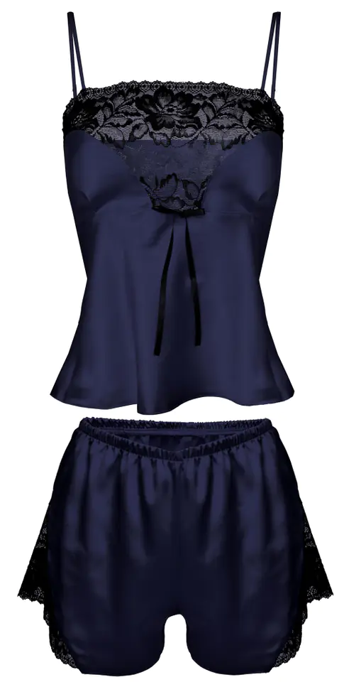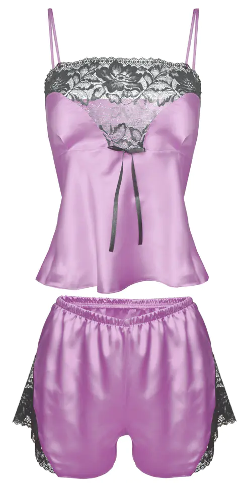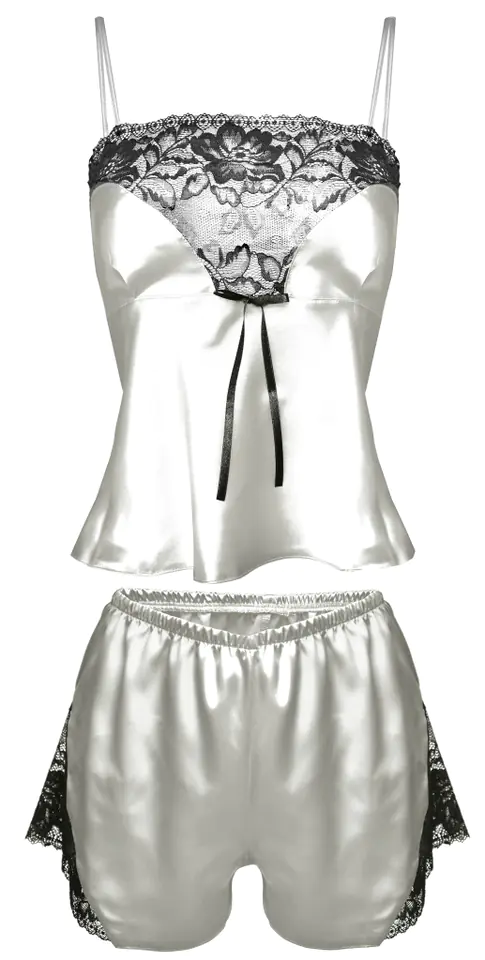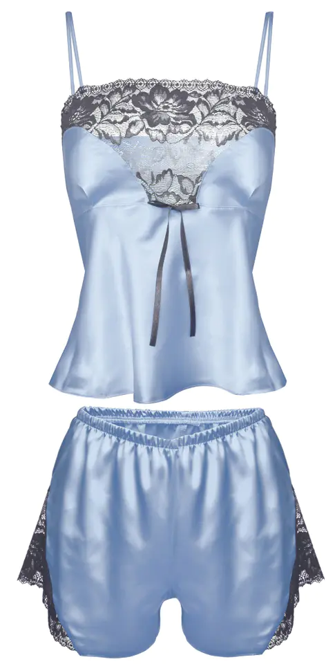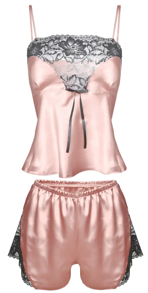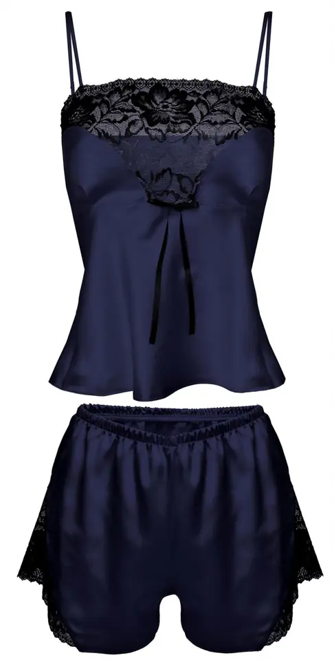 Calypso to jeden z najlepszych kompletów sezonu. Satynowy, piękny, uzupełniony wstawkami z koronki, prezentuje się elegancko i zmysłowo. Bluzeczka na cieniutkich, regulowanych ramiączkach, o miękkich miseczkach w kształcie serca, z koronką wzdłuż dekoltu, jest lekko dopasowana w górnej części i luźniejsza w rejonie brzuszka. Szorty o odpowiedniej długości są luźne, seksowne i sprawiają, że biodra wyglądają w nich bardzo ponętnie. Boki z koronki. Skład: 100% poliester.