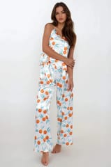 Comfortable, two-piece pajamas made of soft, printed satin. Designed to emphasize the bust line, enchant with a delicate neckline and beautiful, thin straps, the length of which can be adjusted. Long pants with comfortable legs, on a soft elastic band at the waist. Composition: 100% polyester.