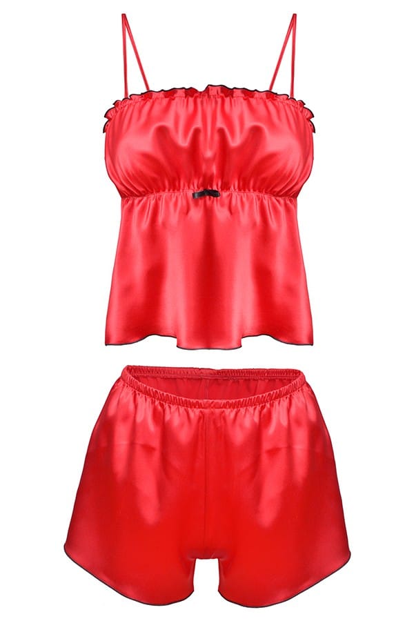 100% POLIESTER KOMPLECIK SKŁADA SIĘ Z KOSZULKI I KRÓTKICH SPODENEK DO GÓRY, Z PRZODU KOSZULKI I POD BIUSTEM PRZYSZYTA JEST DELIKATNA GUMKA. GÓRA I DÓŁ HALKI OBSZYTE SĄ MEREŻKĄ. RAMIĄCZKA CIENKIE, REGULOWANE. SPODENKI NA GUMCE OBSZYTE MEREŻKĄ.