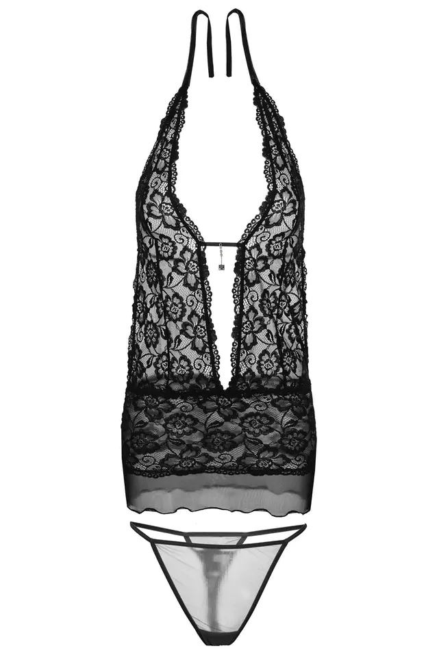 SEKSOWNY KOMPLET DWU CZĘŚCIOWY W KTÓREGO W SKŁAD WCHODZĄ KOSZULKA ORAZ STRINGI. KOSZULA WYKONANA JEST Z DELIKATNEJ ELASTYCZNEJ, PRZYJEMNEJ KORONKI Z POGŁĘBIONYM DEKOLTEM, ZDOBIONYM BIŻUTERYJNĄ SYMILKĄ. TYŁ ODCIĘTY OD PASA, WIĄZANA NA SZYI ORAZ DODATKOWO NA PLECACH. DÓŁ WYKOŃCZONY DELIKATNYM TIULEM. DOSTĘPNA WERSJA KOLORYSTYCZNA: CZERWONY, CZARNY, ECRU. 100% POLIESTER