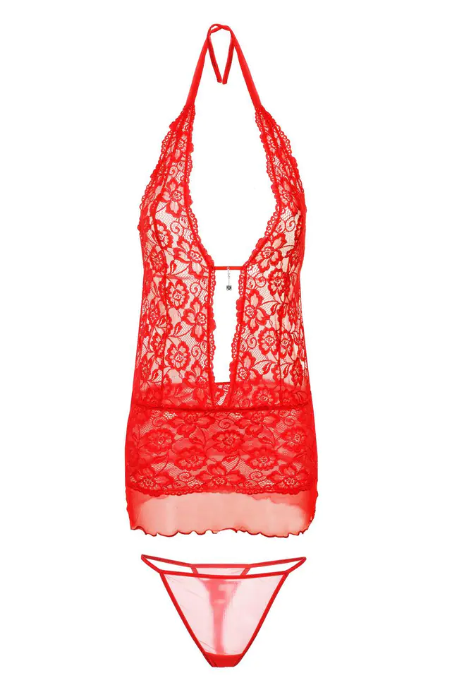 SEKSOWNY KOMPLET DWU CZĘŚCIOWY W KTÓREGO W SKŁAD WCHODZĄ KOSZULKA ORAZ STRINGI. KOSZULA WYKONANA JEST Z DELIKATNEJ ELASTYCZNEJ, PRZYJEMNEJ KORONKI Z POGŁĘBIONYM DEKOLTEM, ZDOBIONYM BIŻUTERYJNĄ SYMILKĄ. TYŁ ODCIĘTY OD PASA, WIĄZANA NA SZYI ORAZ DODATKOWO NA PLECACH. DÓŁ WYKOŃCZONY DELIKATNYM TIULEM. DOSTĘPNA WERSJA KOLORYSTYCZNA: CZERWONY, CZARNY, ECRU. 100% POLIESTER