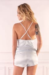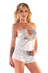 Comfortable and impressive set in Sky Blue (slightly darker than in the picture), which will be great as tempting pajamas. The blouse subtly emphasizes the features of the body, tempts with a lace décor and a rhinestone chain, visible on the neckline line. She is sexy and curious. Shorts with elastic band with straight legs are a perfect complement to this set. Composition: 95% polyester, 5% elastane.
