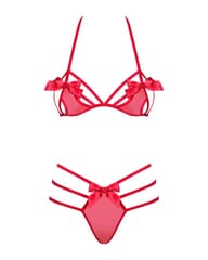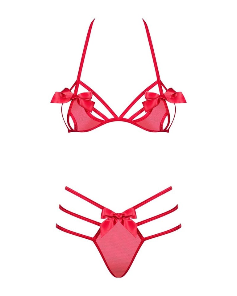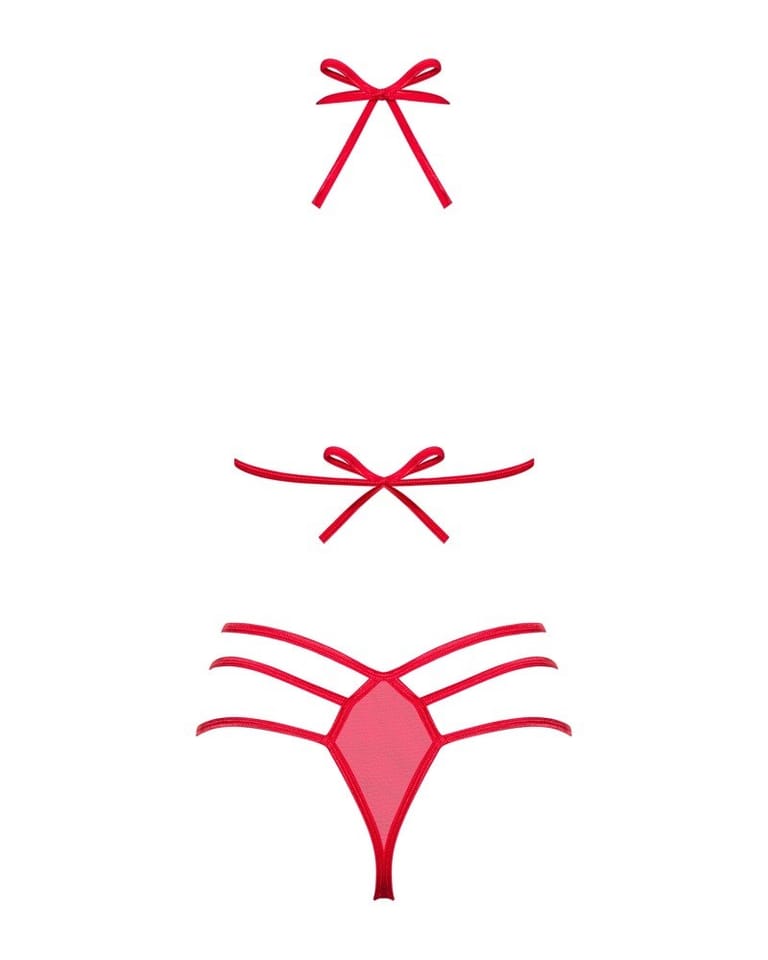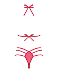 Sexy, red set from Obsessive - Giftella model, perfect for Valentine's Day and not only... Bra with partially open cups, decorated with bows in the nipple area, is impressive. Cut tied like a bikini - on the back and neck. Thong will emphasize your hips with a cascade of thin, red stripes. On the front - a charming bow. Composition: 94% polyamide, 6% elastane.