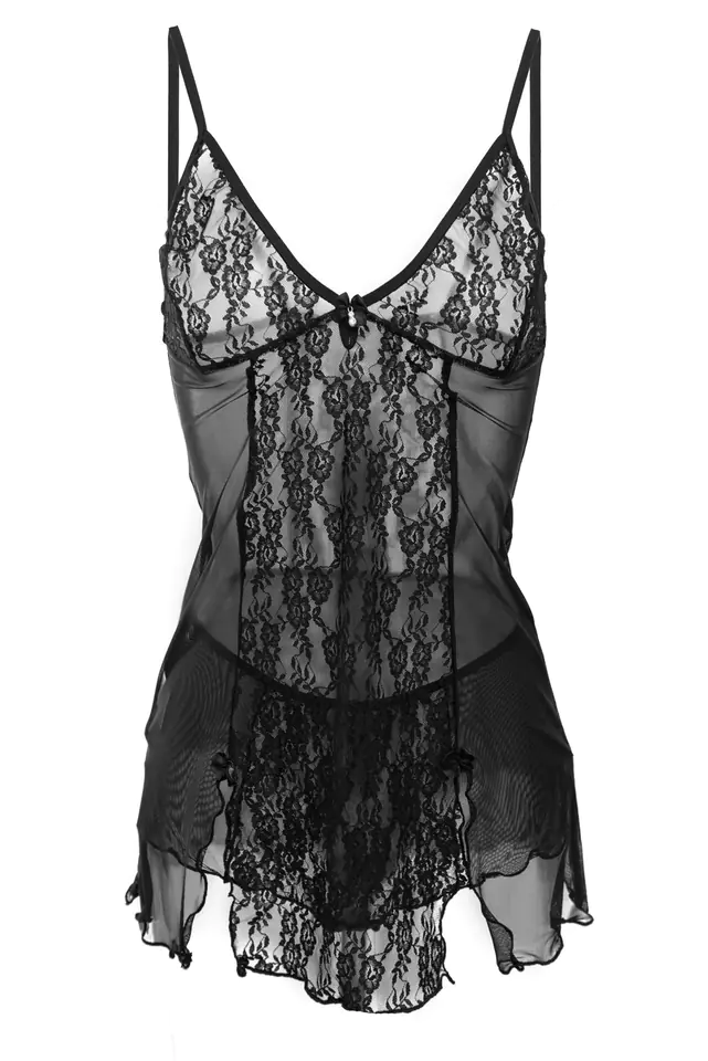 Efektowny komplet w czarnym kolorze. Koszulka wykonana z wyjątkowo miękkiej, elastycznej koronki o kwiecistym wzorze, uzupełniona gładkimi, tiulowymi bokami. Miseczki profilowane, bez fiszbin, pozwalają uzyskać kuszący dekolt. Środek z cyrkonią. Ramiączka cieniutkie i regulowane. W zestawie znajdują się wygodne szorty. Skład: 100% poliamid.