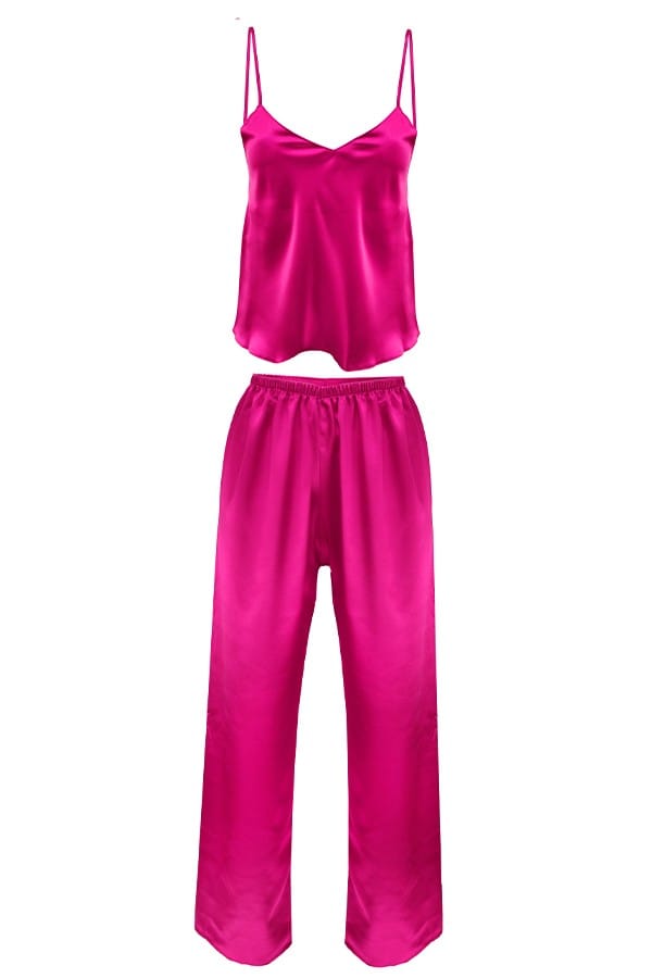 KOMPLET SKŁADA SIĘ Z KOSZULKI ORAZ DŁUGICH SPODNIPRZÓD KOSZULKI TWORZY TRÓJKĄTNY DEKOLTSPODENKI NA GUMCECAŁOŚĆ USZYTA Z SATYNYRAMIĄCZKA CIENKIE I REGULOWANE