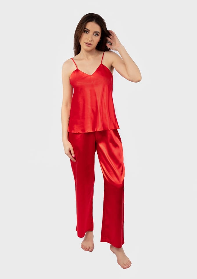 KOMPLET SKŁADA SIĘ Z KOSZULKI ORAZ DŁUGICH SPODNIPRZÓD KOSZULKI TWORZY TRÓJKĄTNY DEKOLTSPODENKI NA GUMCECAŁOŚĆ USZYTA Z SATYNYRAMIĄCZKA CIENKIE I REGULOWANE