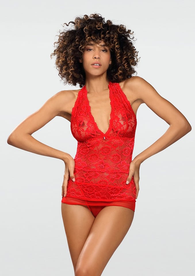 SEKSOWNY KOMPLET DWUCZĘŚCIOWY, W KTÓREGO SKŁAD WCHODZĄ KOSZULKA ORAZ STRINGI. KOSZULKA WYKONANA Z DELIKATNEJ KORONKI Z GŁĘBOKIM DEKOLTEM ZDOBIONY BIŻUTERYJNĄ SYMILKĄ. KOSZULKA JEST PRZEKŁADANA PRZEZ GŁOWĘ ORAZ WYKOŃCZONA TIULEM. DOSTĘPNE KOLORY: CZERWONY CZARNY ORAZ ECRU. 100% POLIESTER