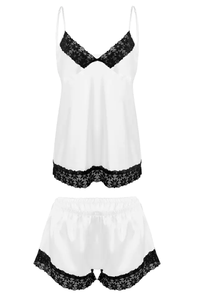 SATYNOWY KOMPLECIK W KTÓRY SKŁAD WCHODZI KOSZULKA ORAZ SPODENKI. GÓRĘ ORAZ DÓŁ ZDOBI DELIKATNA KORONKA. DOSTĘPNE WSZYSTKIE WERSJE KOLORYSTYCZNE Z CZARNĄ KORONKĄ. RAMIĄCZKA CIENKIE I REGULOWANE.