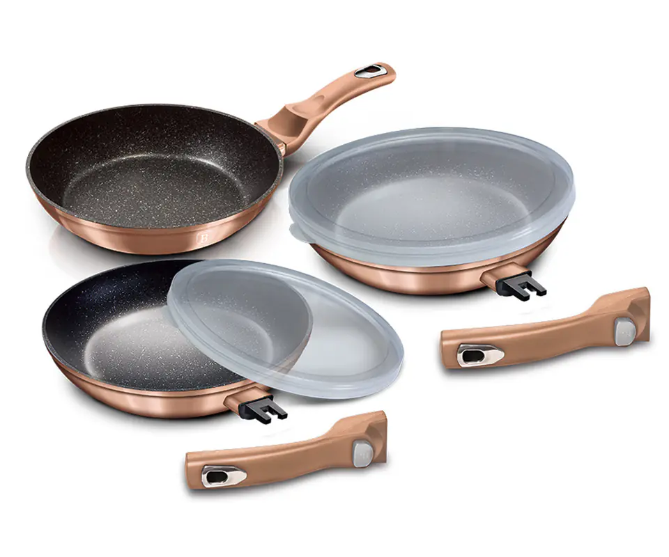 The pots and accessories of the Rose Gold Edition series from BERLINGER HAUS are made of high-quality forged aluminium coated inside with a triple granite coating (marble) with a very high hardness coefficient. The outer shell is available in several color versions with a characteristic metallic sheen. These attractive and fashionable dishes are equipped with SOFT TOUCH handles (silicone handle) as standard. Suitable for all types of cookers: gas, electric, ceramic, halogen, induction. The TURBO INDUCTION system (they heat up very quickly) can save up to 35% of energy.