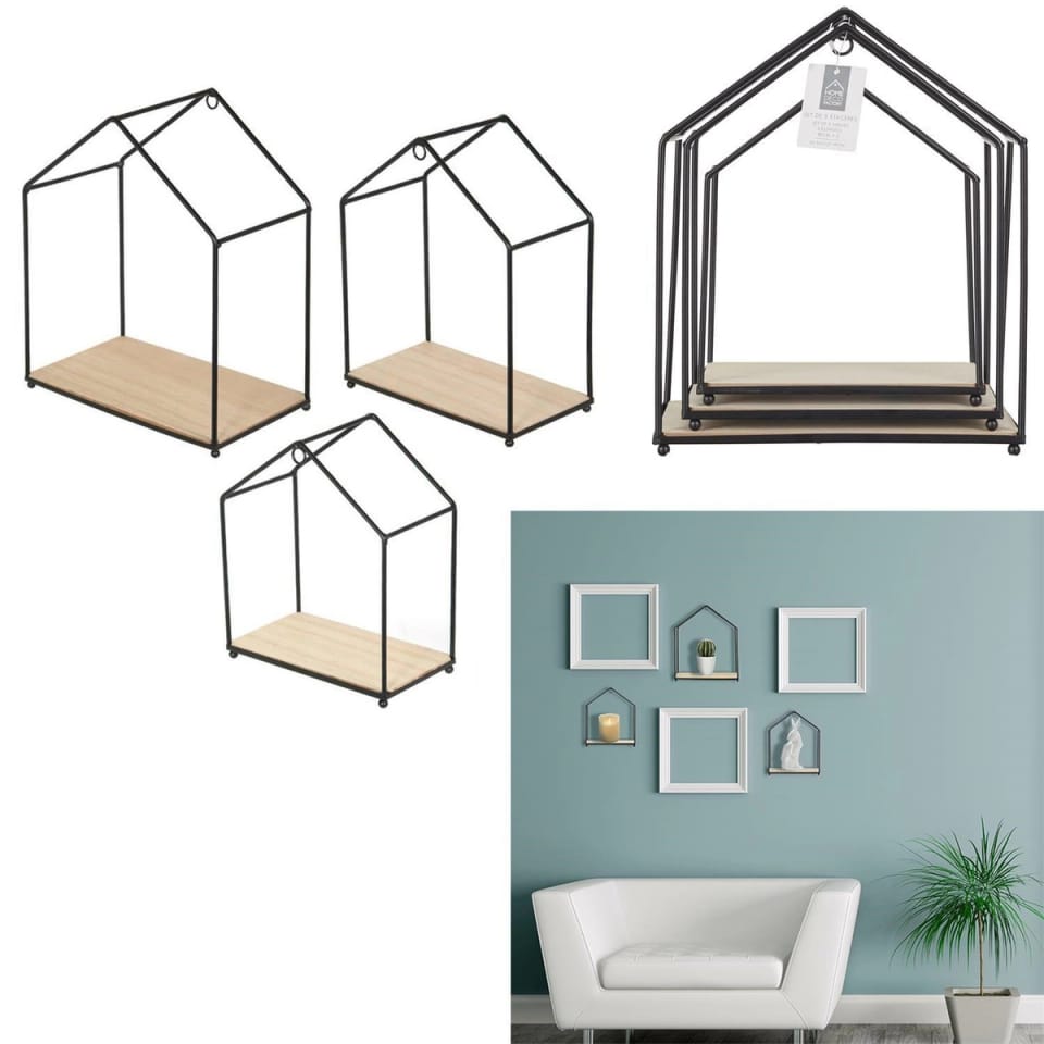 Follow the wired and industrial trend with these three house-shaped shelf! These models are made of wooden MDF and metal. They will bring a decorative and original note to your interior, while allowing you to store your favorite books, flowers or some personal items to display. Detail: Construction for attaching or fastening - Dimensions: 23x27x13 cm - 20x24x11 cm - 17.5x20.5x9.5 cm. Carton dimensions: 31 x 29 x 47 cm