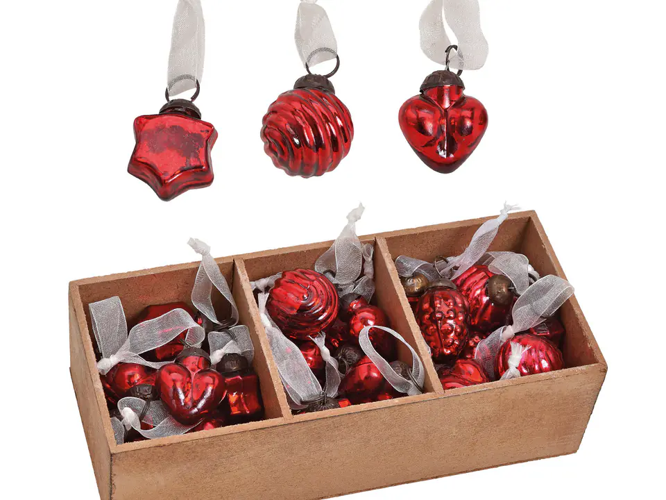 Set of 36 red glass baubles in a wooden box 25x5x9cm