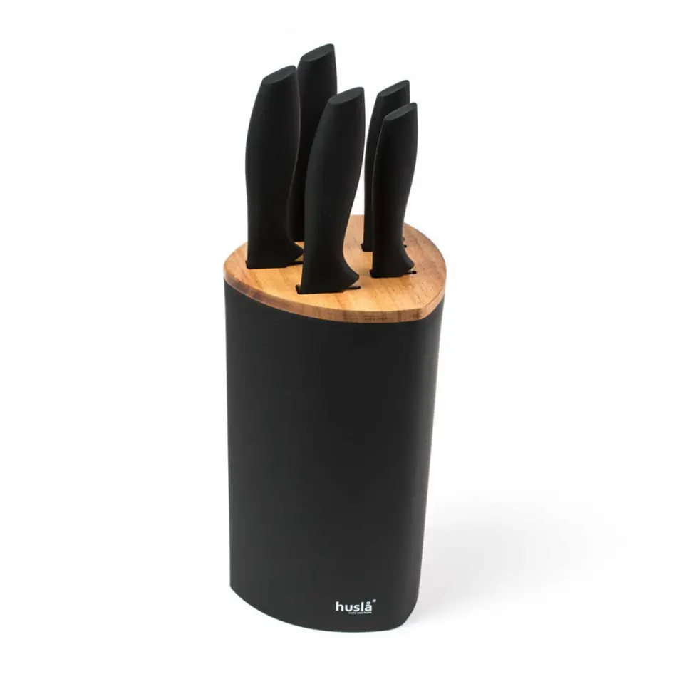 Designer black matte block with elements of acacia wood and a set of 5 knives made of very high quality stainless steel makes it impress at first sight with its elegance and solidity. Natural acacia wood additionally gives our product a warm image. Thanks to this, it feels great in any kitchen interior. Soft touch handles coated with a thin layer of silicone combined with an ergonomic shape make working with them a real pleasure.
