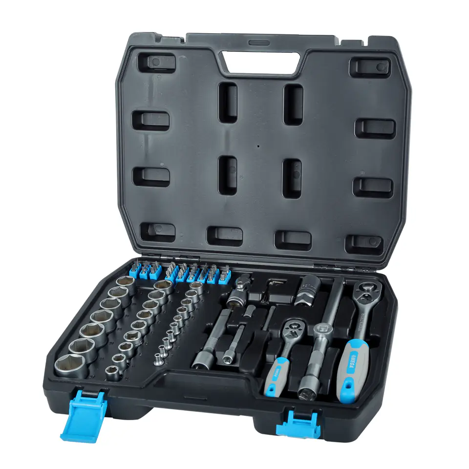 The set of socket wrenches of the Polish brand Mega with the symbol 58072 consists of 72 elements. Socket wrenches are ideal for home use, DIY or in the workshop. To maintain high hardness, carbon compounds have been added. The set includes a wide range of accessories, which allows versatile operation for many jobs. The product includes socket wrenches and sockets for 1/2" and 1/4". Rattles, on the other hand, have a mechanism with 72 teeth made of chrome-molybdenum steel and a non-slip handle. The entire product is delivered in a transport case that will facilitate the storage and transport of tools.