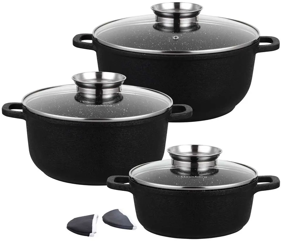 8-piece pot set with extremely durable granite coating. On the outside, covered with a coating with a porous, cracked Crack Design structure. This gives an interesting visual effect. Equipped with glass lids with Aroma Knob handle in which there is an oil dispenser, thanks to which oil or liquid spices can be served during cooking or stewing.