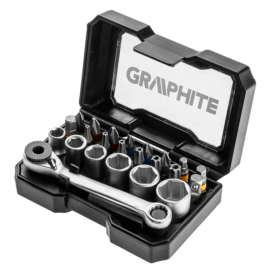 A set of basic graphite tips and sockets (ref. no. 56H610), ideal for minor assembly work. Compact packaging. Rattle allows for solid and quick twisting or unscrewing of elements