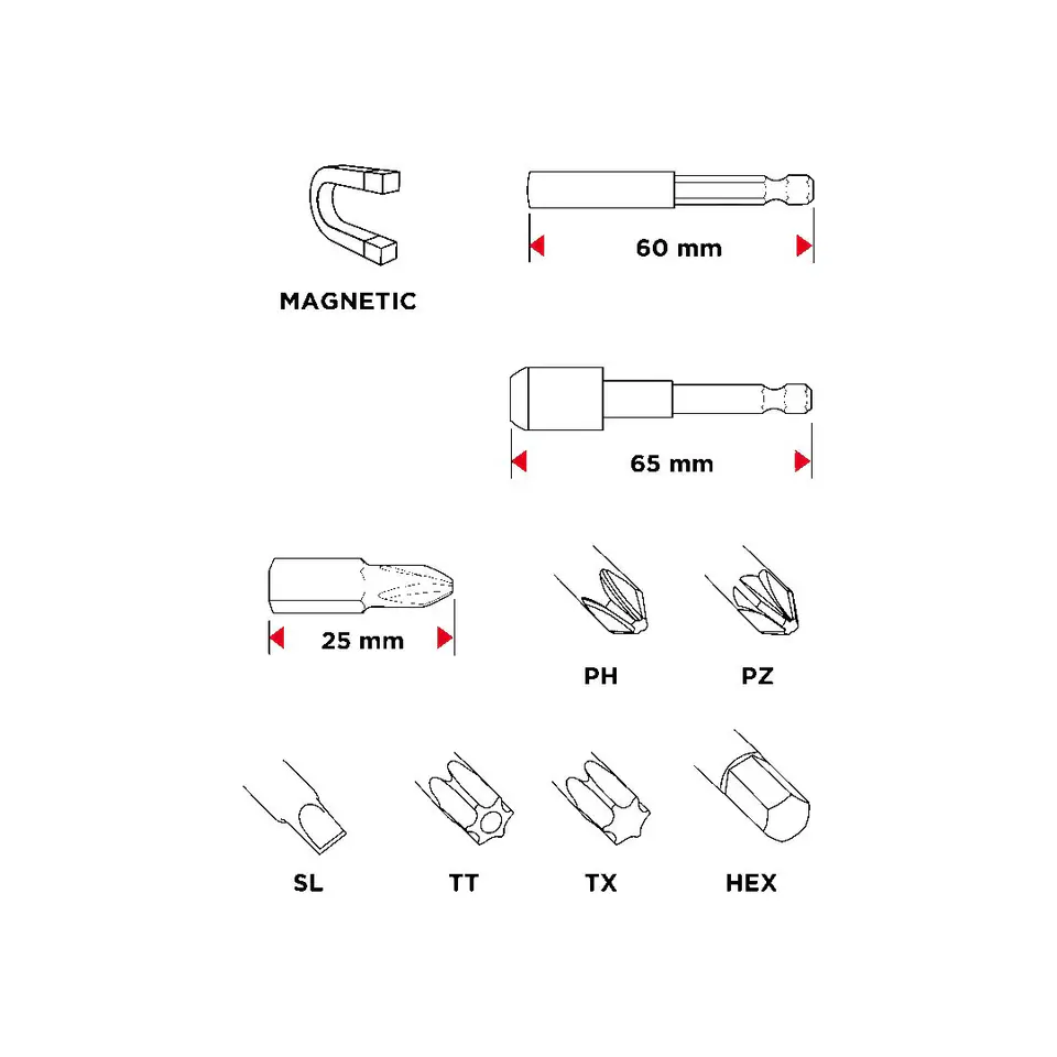 A large, universal set of GRAPHITE terminals (Ref. 56H600), containing different types of bits needed for screwing. The most commonly used sizes (PH2, PZ2 ..) are repeated several times each.