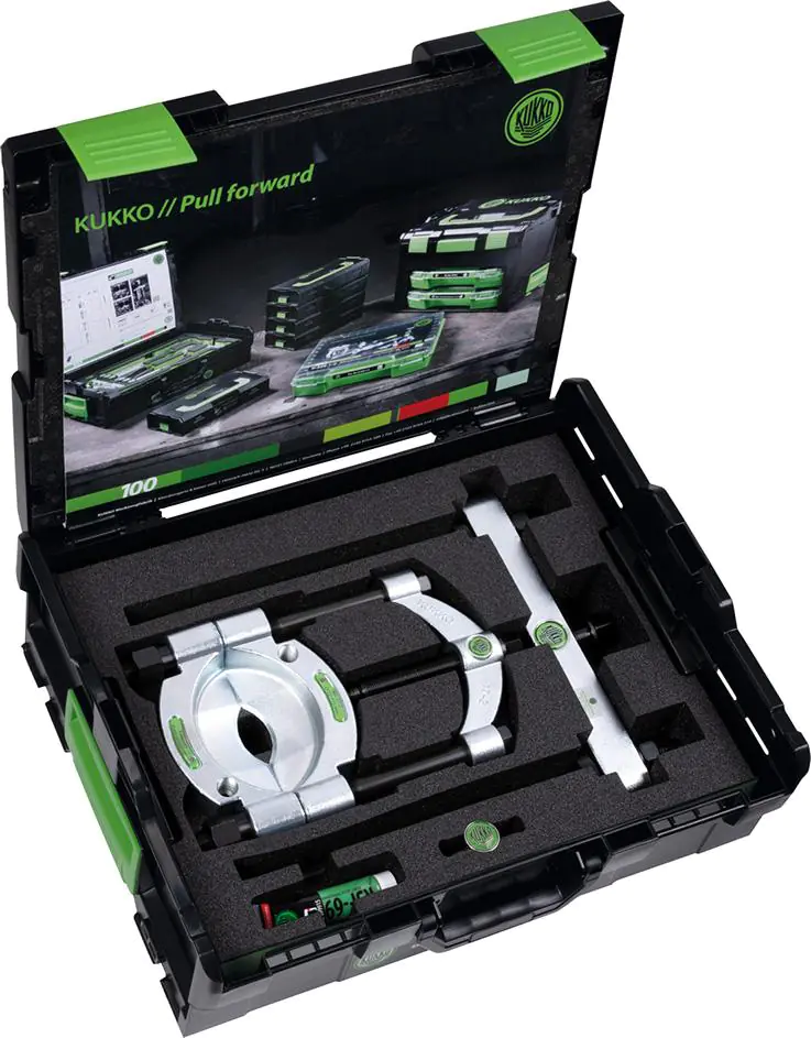Application: For pulling rolling bearings, roller bearings, inner rings and other co-plane mounted parts. Implementation: Delivery in the L-Boxx toolbox with always visible instruction manual on the lid.