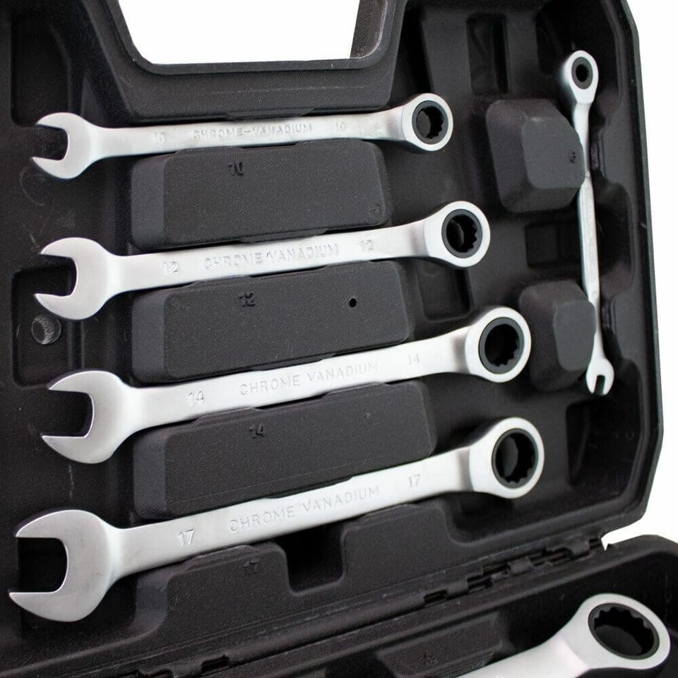 The kit consists of 12 ratchet wrenches made of durable and resistant vanadium steel and is supplied in a robust plastic housing.