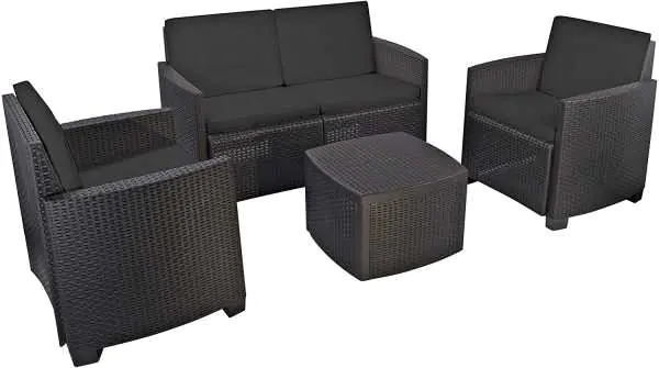 Garden furniture set Etna 4 pieces with pillows The luxurious garden furniture set consists of 2 armchairs, a sofa and a coffee table. Comfortable cushions are also placed on the armchairs and sofa. Specification: sofa dimensions: 61X129X77 cm armchair dimensions: 61X73X77 cm table dimensions: 54X54X40 cm material: plastic with rattan effect color: dark grey set weight: 48 kg