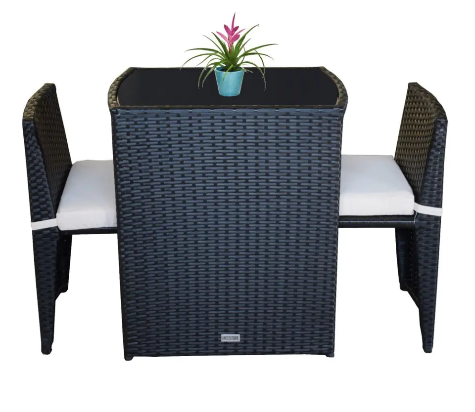 This elegant furniture set in black color is made of high quality synthetic rattan - a material resistant to harmful weather conditions. The set consists of 2 chairs and a coffee table with a black glass top. Due to its small dimensions, our furniture is perfect for a balcony, terrace or garden. An additional advantage of furniture is its compact size. The chairs can be slid under the table, so the whole set takes up little space. The chairs have cushions in contrasting beige color for greater comfort during use.