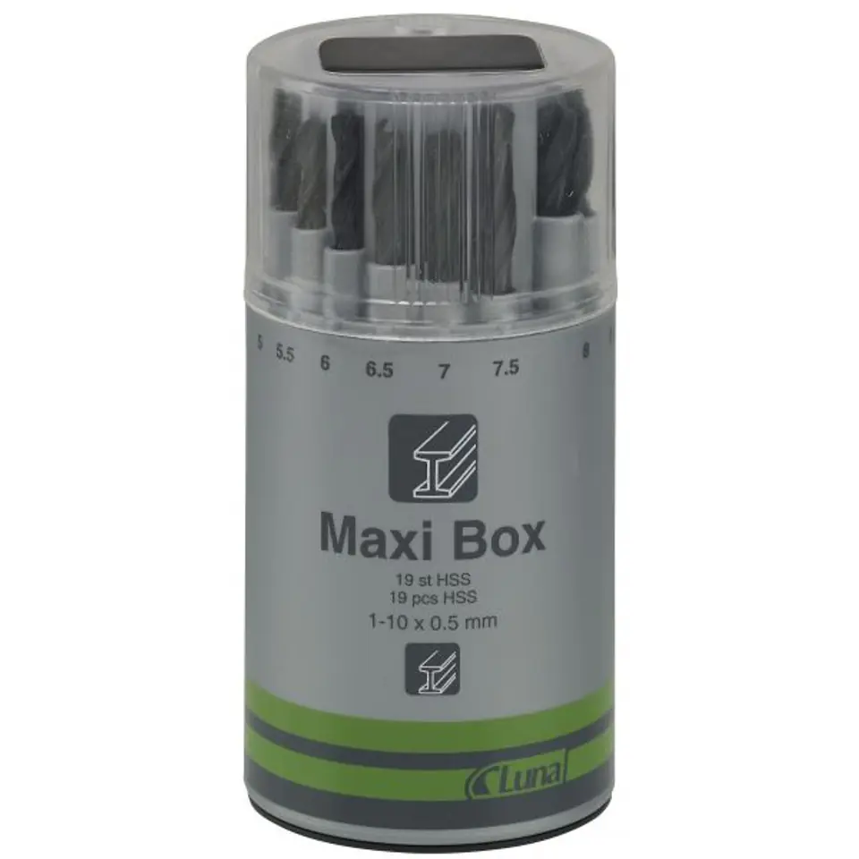 Maxi-Box. High-speed steel drills. In a plastic cassette with a rotating lid, set on the marking corresponding to the diameter of the desired drill. Only one drill can be removed per setting