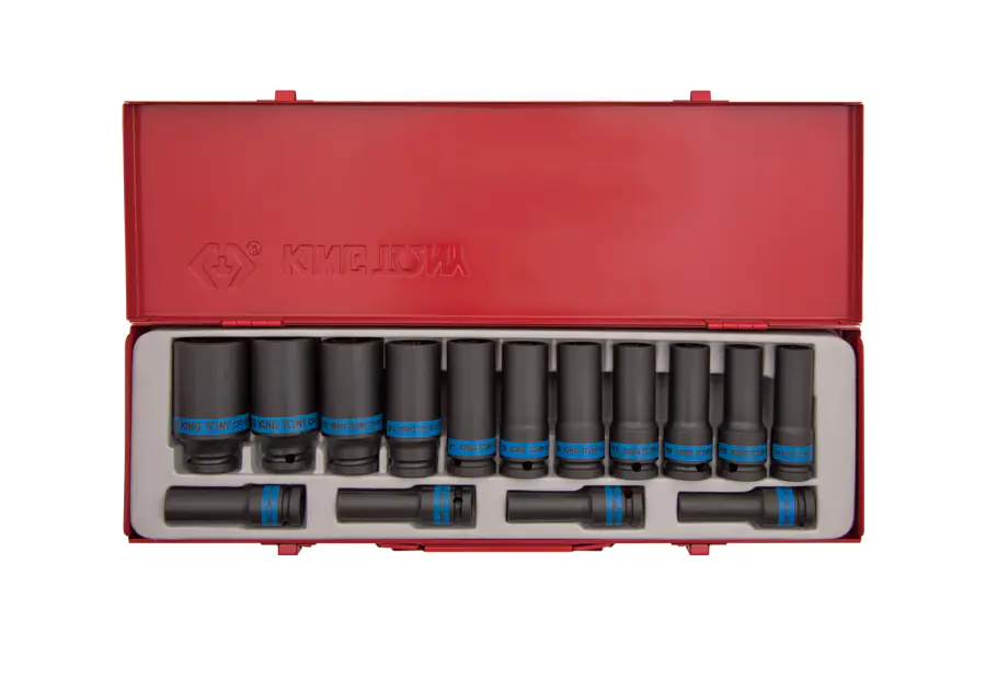 Set of long impact sockets 1/2" from King Tony. The set includes 15 sockets: 10, 11, 12, 13, 14, 15, 16, 17, 19, 21, 22, 24, 27, 30, 32. Set in metal cassette